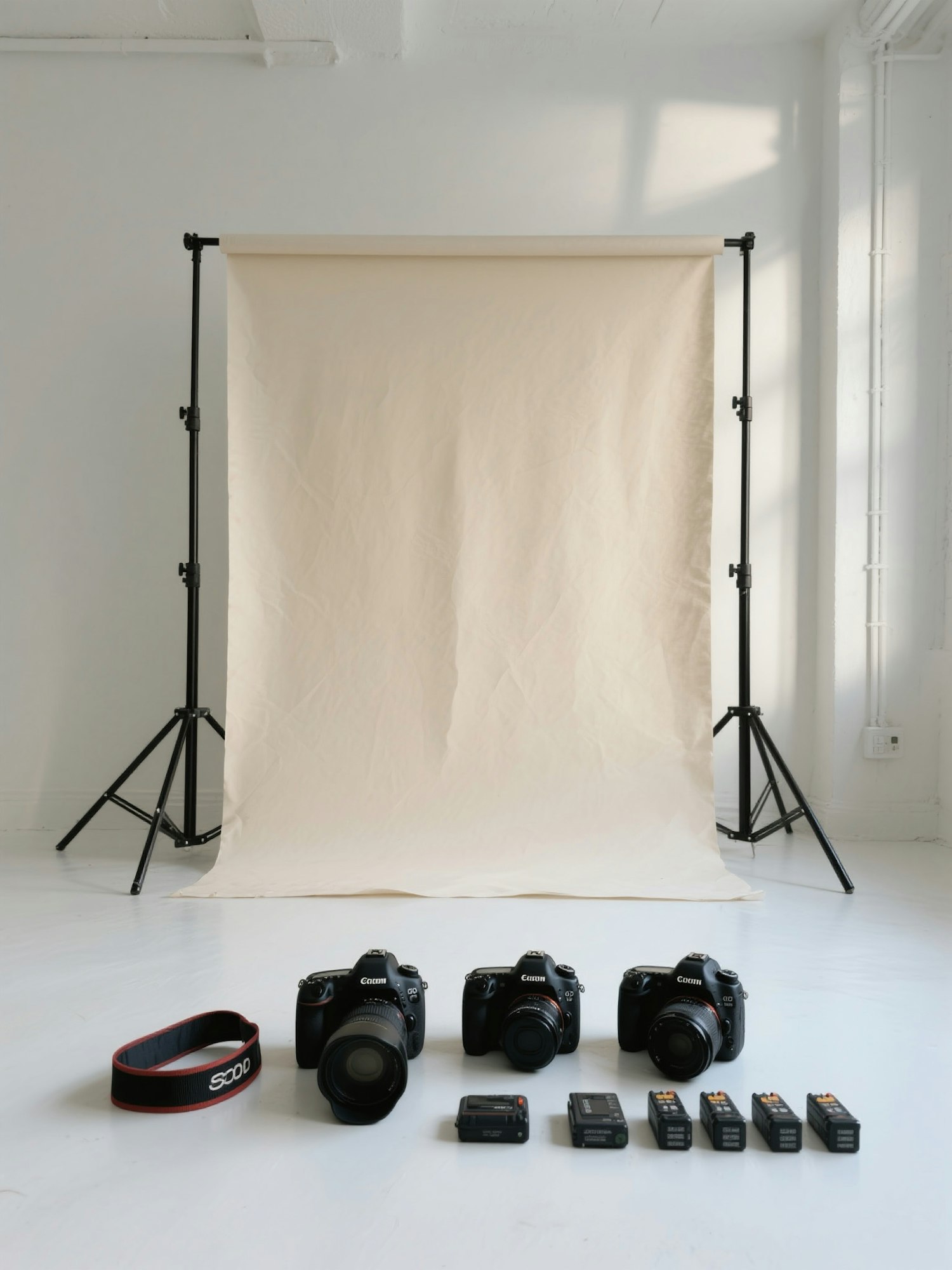 A minimal photography studio space, beige seamless paper backdrop on a stand, soft shadows, white wall and floor, assorted professional photography gear placed in front, including cameras, straps and batteries, aesthetic documentary angle