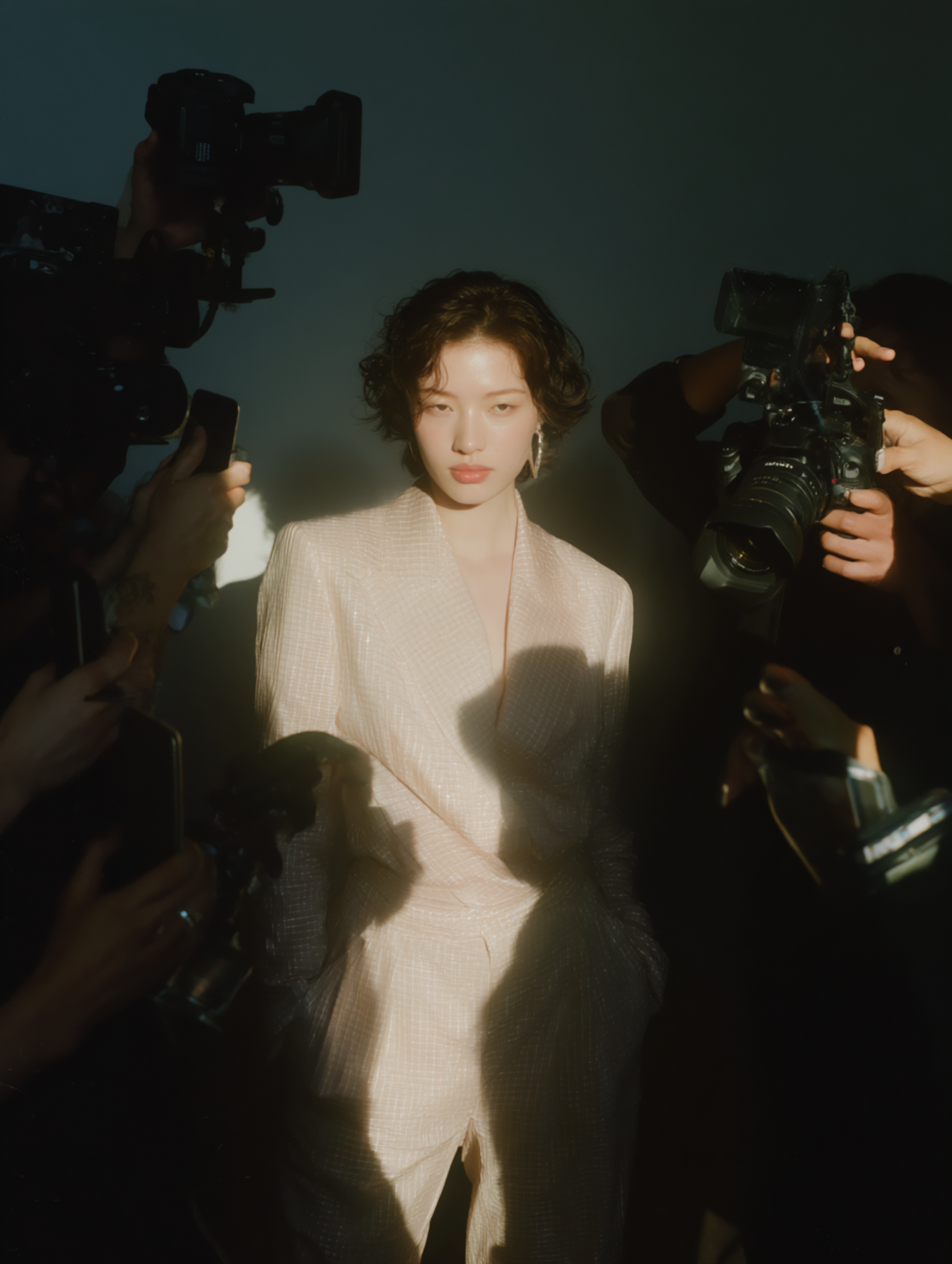 A woman in a light-textured suit stands under dramatic lighting, surrounded by cameras, creating a cinematic and stylish atmosphere.