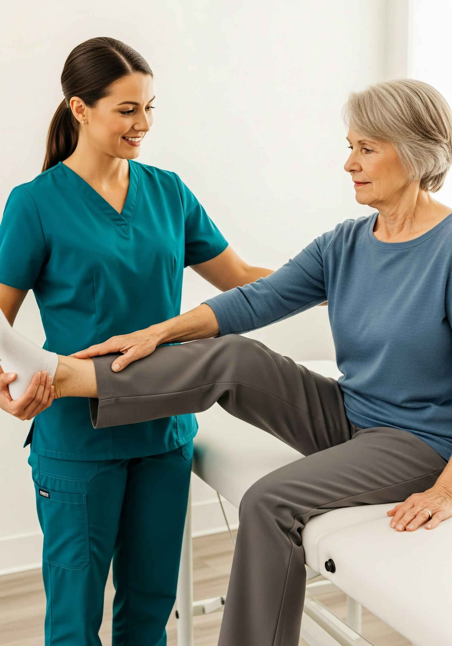 A healthcare professional assists an older woman in a physical therapy session, focusing on leg exercises in a bright, clean clinic.