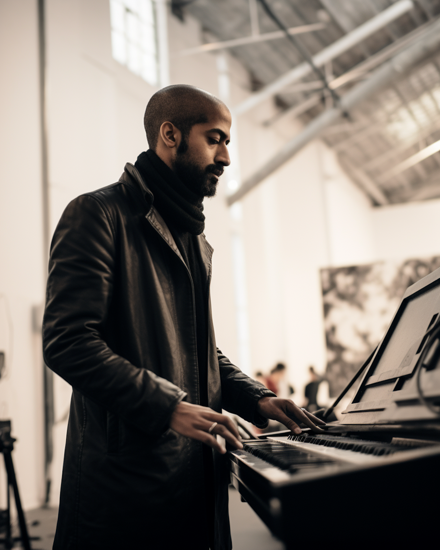Bald man with a beard playing keyboard in a spacious, well-lit room with high ceilings and large windows.