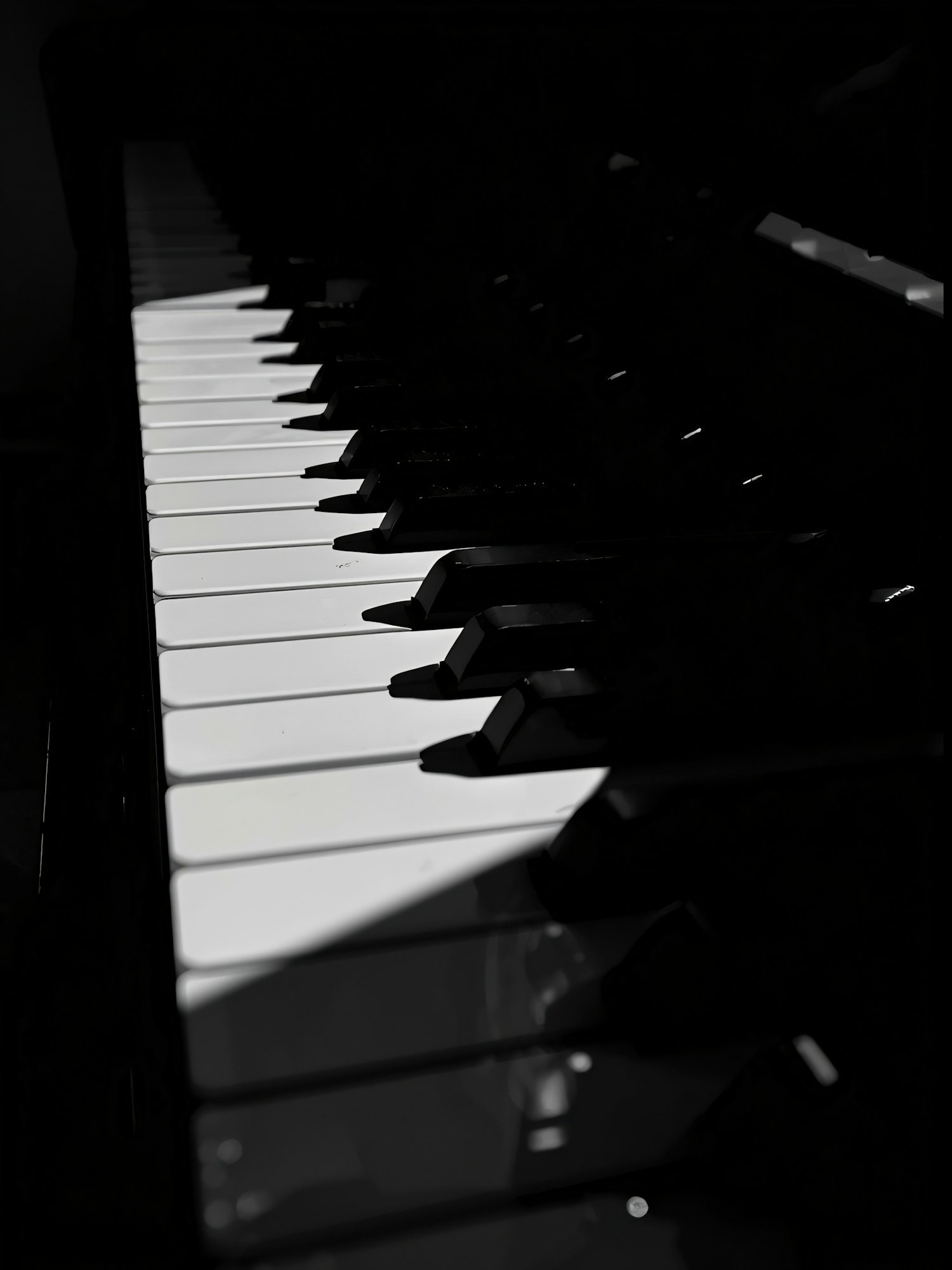 A dramatic close-up of piano keys with striking light and shadow contrast, emphasizing the texture and depth of the keyboard.