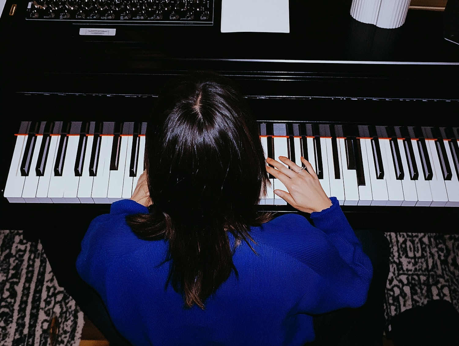 Person in blue sweater playing piano, viewed from above, with sheet music and patterned rug. Cozy and focused musical setting.