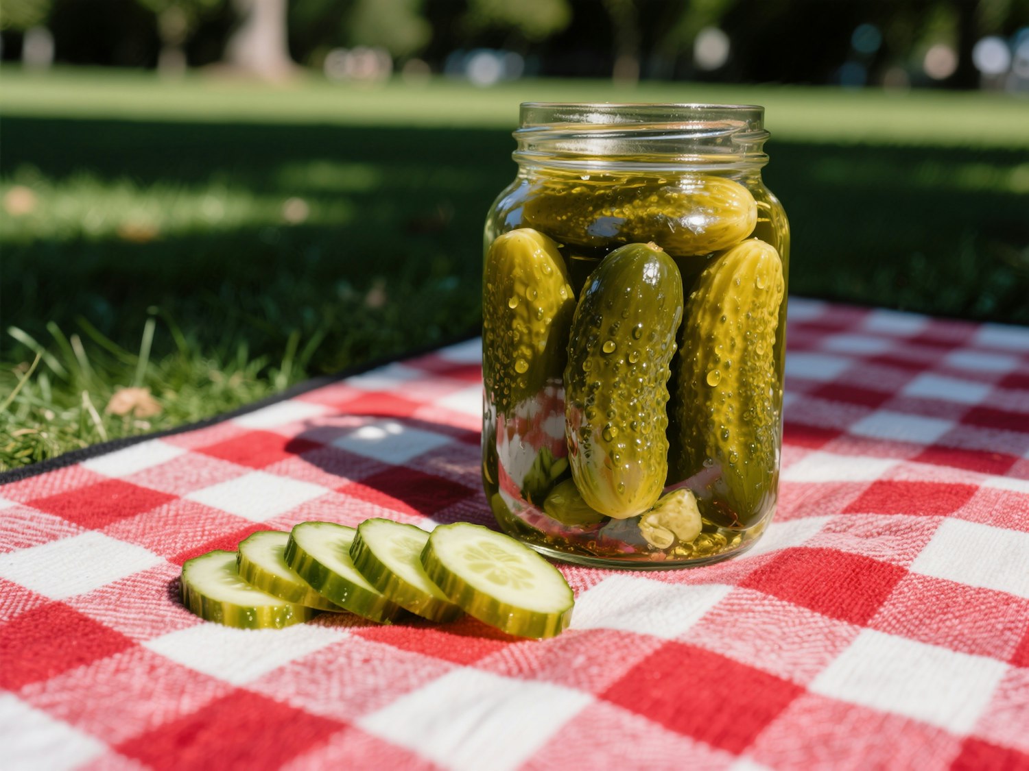 A jar of pickles and cucumber slices on a red checkered picnic blanket in a sunny park setting. Perfect for a summer picnic vibe.