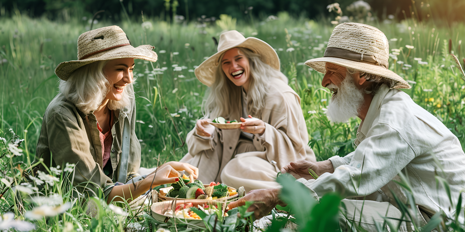 Three people enjoying a picnic in a meadow, surrounded by wildflowers and greenery, sharing laughter and fresh fruits.