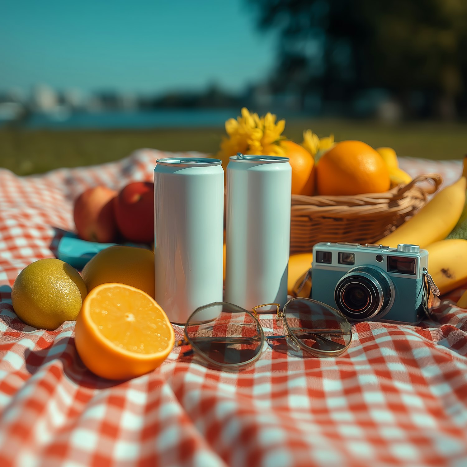 A colorful picnic setup with fruits, drinks, a camera, and sunglasses on a checkered blanket in a sunny park setting.
