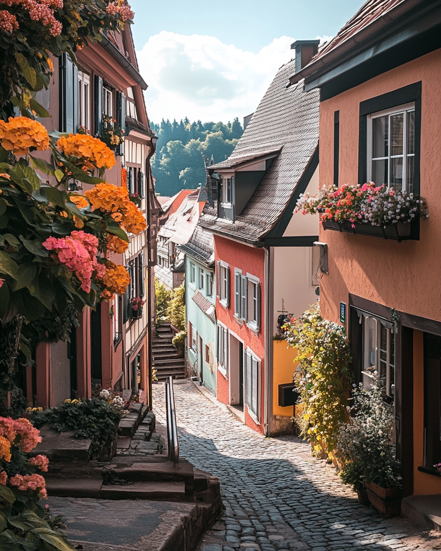 Charming cobblestone street in a European village with colorful houses, flower boxes, and lush greenery under a clear blue sky.