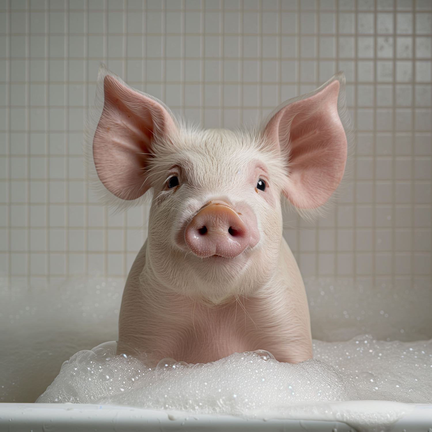 Adorable piglet enjoying a bubble bath in a white tiled bathroom, surrounded by frothy bubbles.