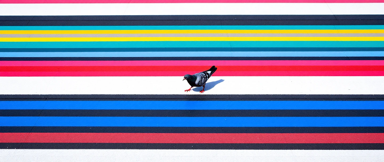 A pigeon stands on colorful horizontal stripes, creating a vibrant and dynamic scene with bold colors and contrasting elements.