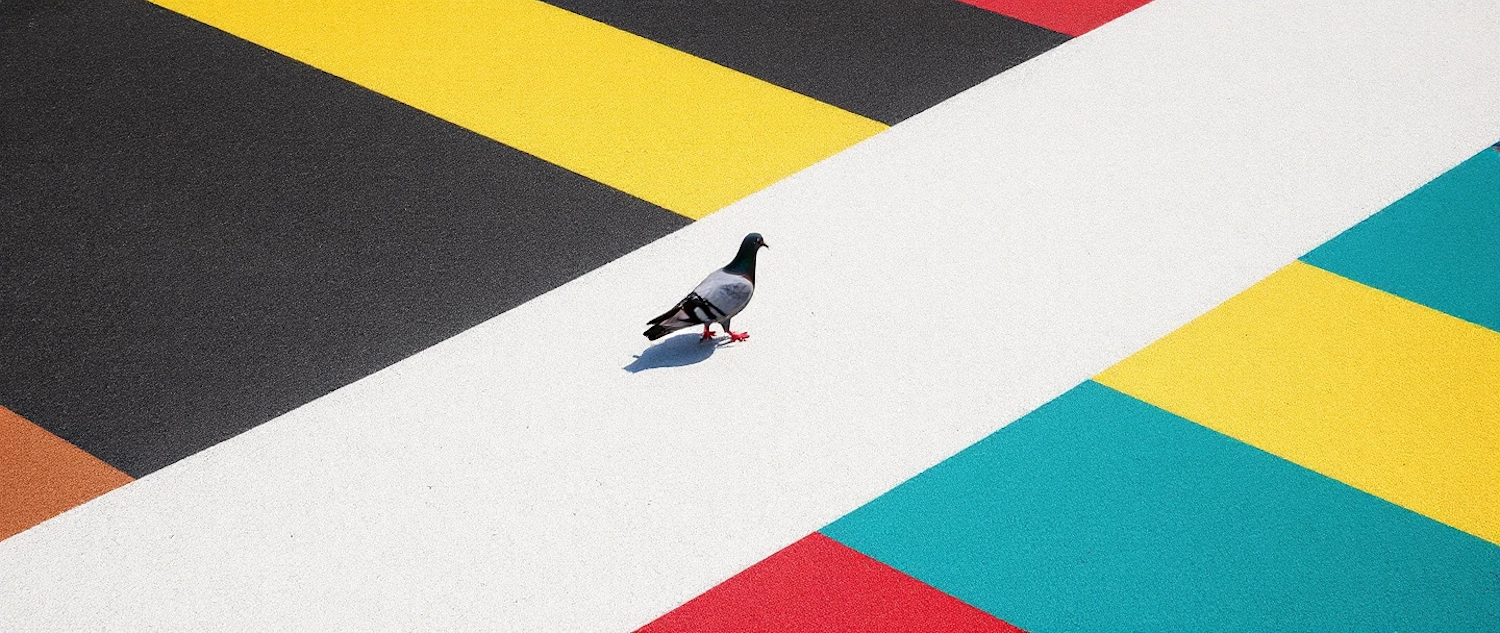 A pigeon walks on a colorful geometric crosswalk with bold stripes in yellow, black, red, teal, and white.