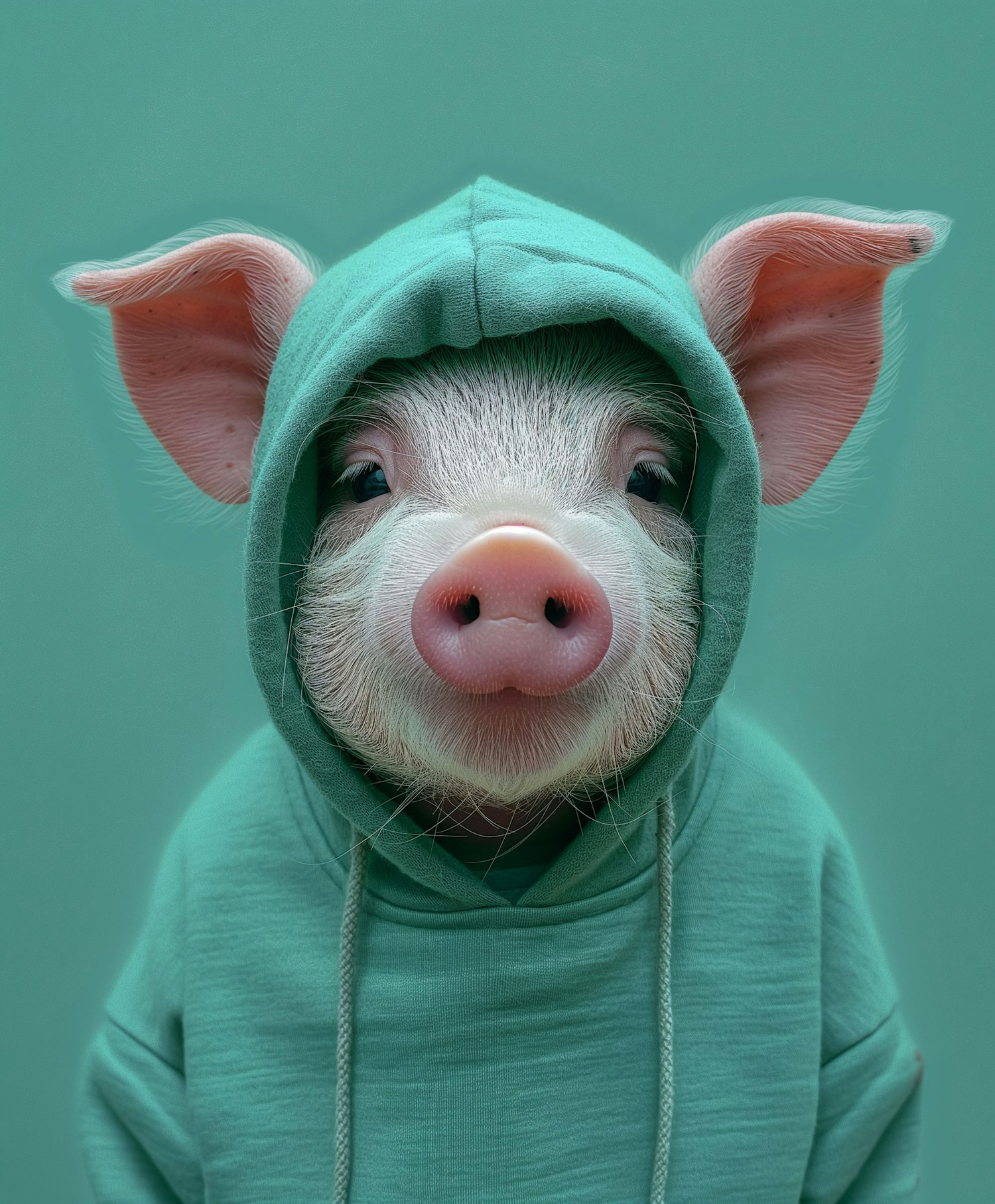 Adorable piglet in a teal hoodie against a matching background, showcasing a playful and harmonious scene.