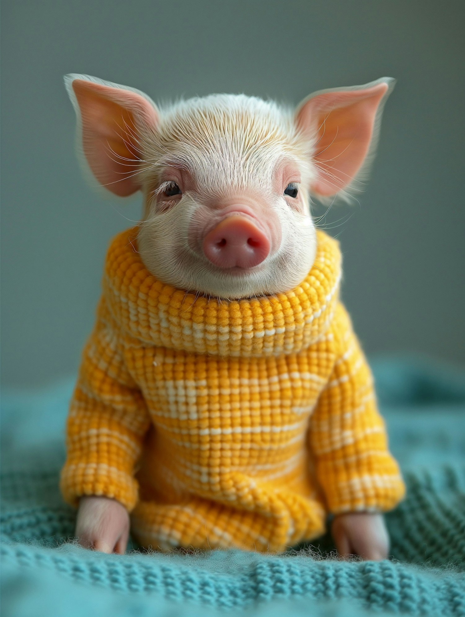 Adorable piglet in a yellow checkered sweater, sitting on a teal blanket with a soft teal background. Perfectly cute and cozy!