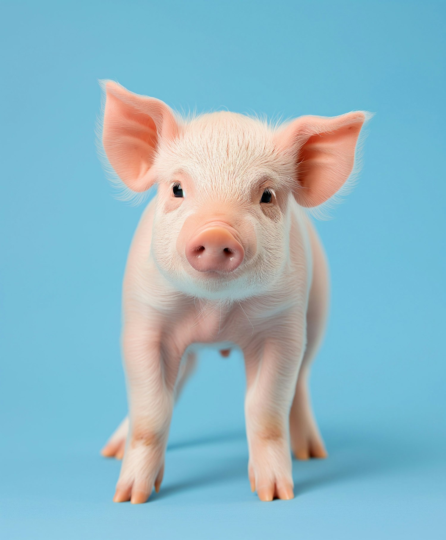 Adorable pink piglet standing against a bright blue background, showcasing its cute features and curious expression.