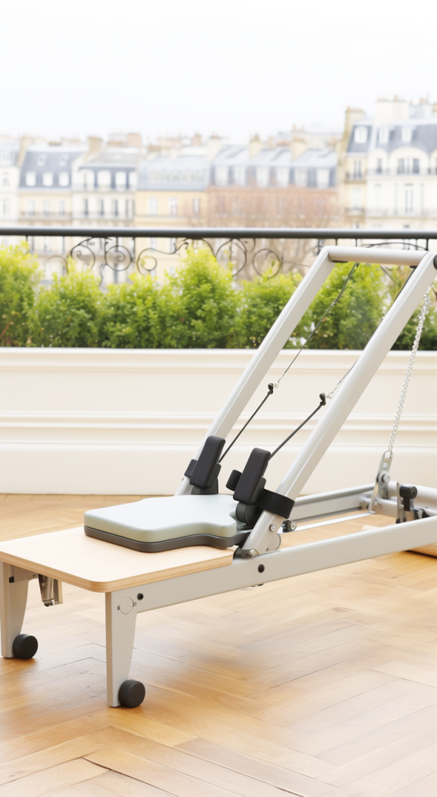 Elegant Pilates reformer in a bright room with European cityscape view, blending fitness and classic architecture.