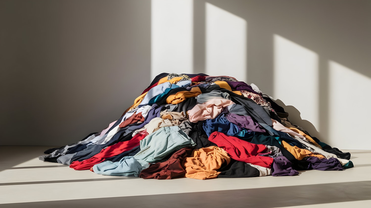 A vibrant pile of colorful clothes in natural sunlight, showcasing textures and fabrics against a minimal background with window shadows.
