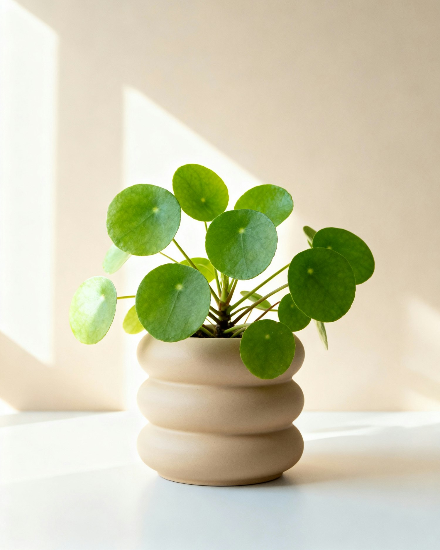 bright natural daylight from the left, soft glowing light, clean airy studio atmosphere, very light beige background with a smooth matte finish, gentle bright shadows, fresh botanical clarity, subtle depth of field, matte ceramic textures, no people. pilea peperomioides centered, vibrant soft-green round leaves, placed in a sculpted beige ceramic container with rounded stacked rings, set on a pale bright surface with a clean and airy feel