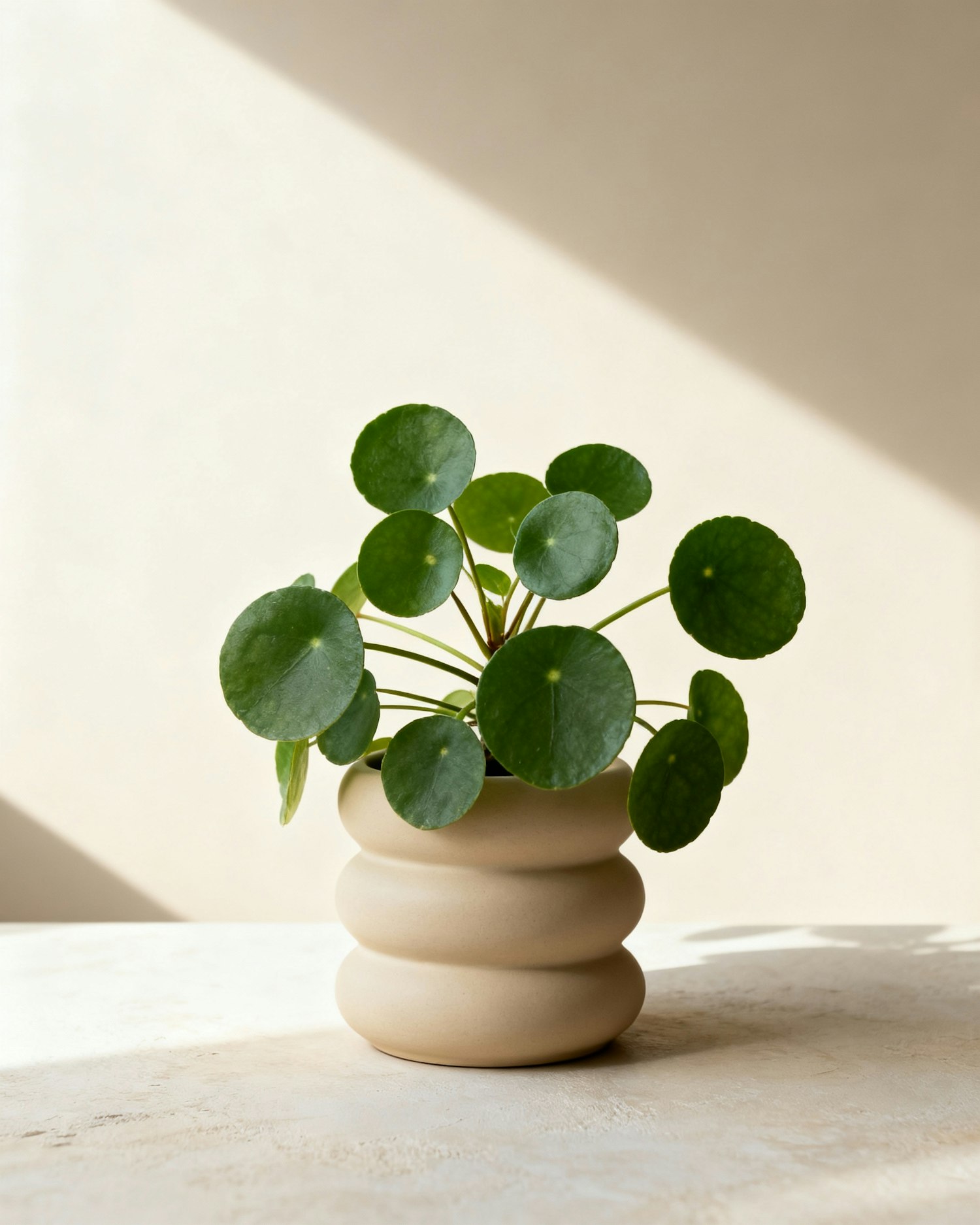 A Pilea peperomioides plant in a modern beige ceramic pot, set against a softly lit minimalist background.