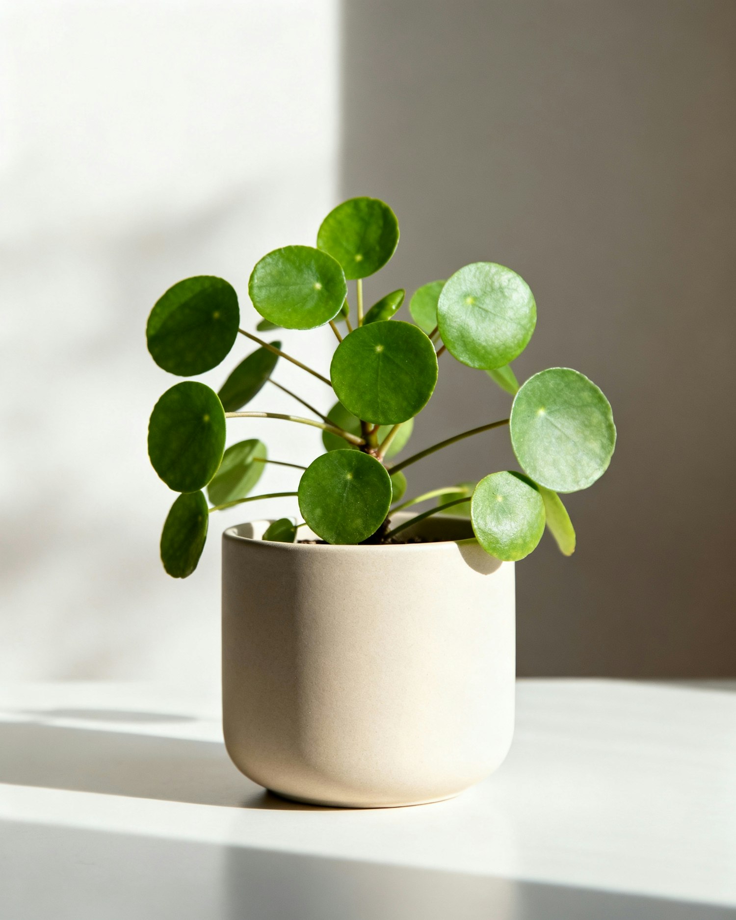 A Pilea peperomioides plant in a beige pot, illuminated by natural light, showcasing its round green leaves on a white surface.