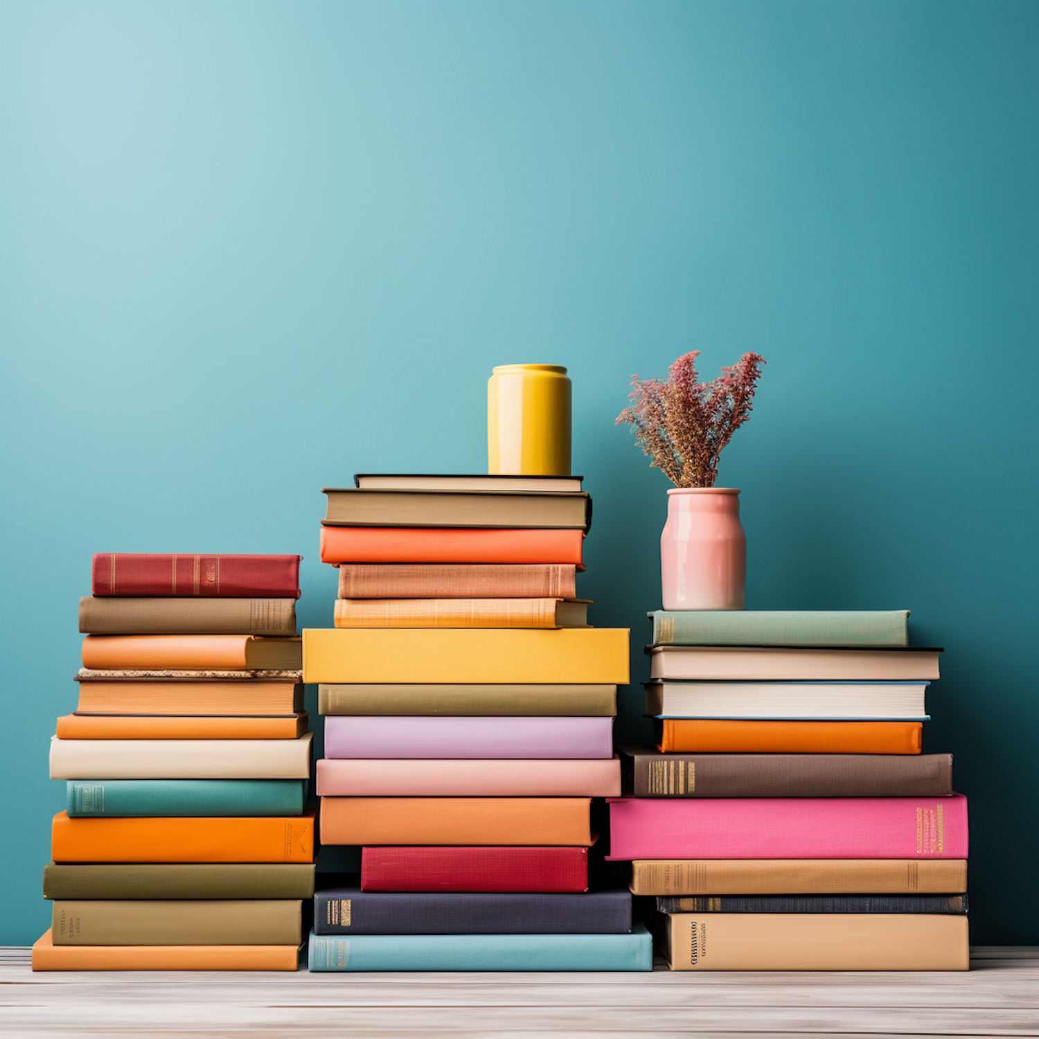 Colorful stack of books with yellow and pink vases against a teal background, creating a vibrant and artistic display.