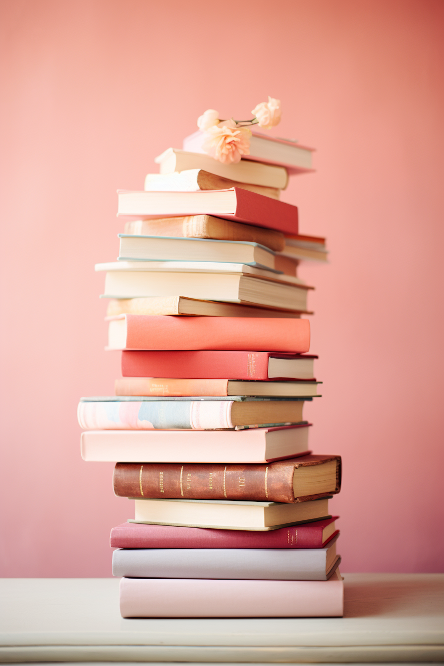 Stack of pastel and warm-toned books with pink flowers on top, set against a soft pink background for a cozy, romantic vibe.