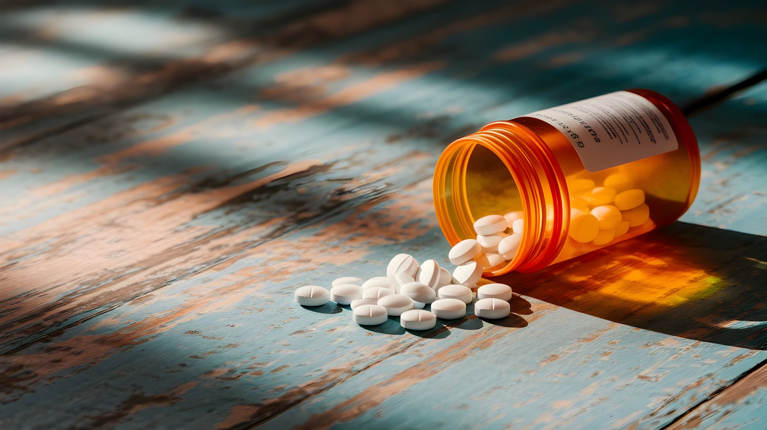 Spilled orange pill bottle with white tablets on a rustic blue table, bathed in warm sunlight and soft shadows.