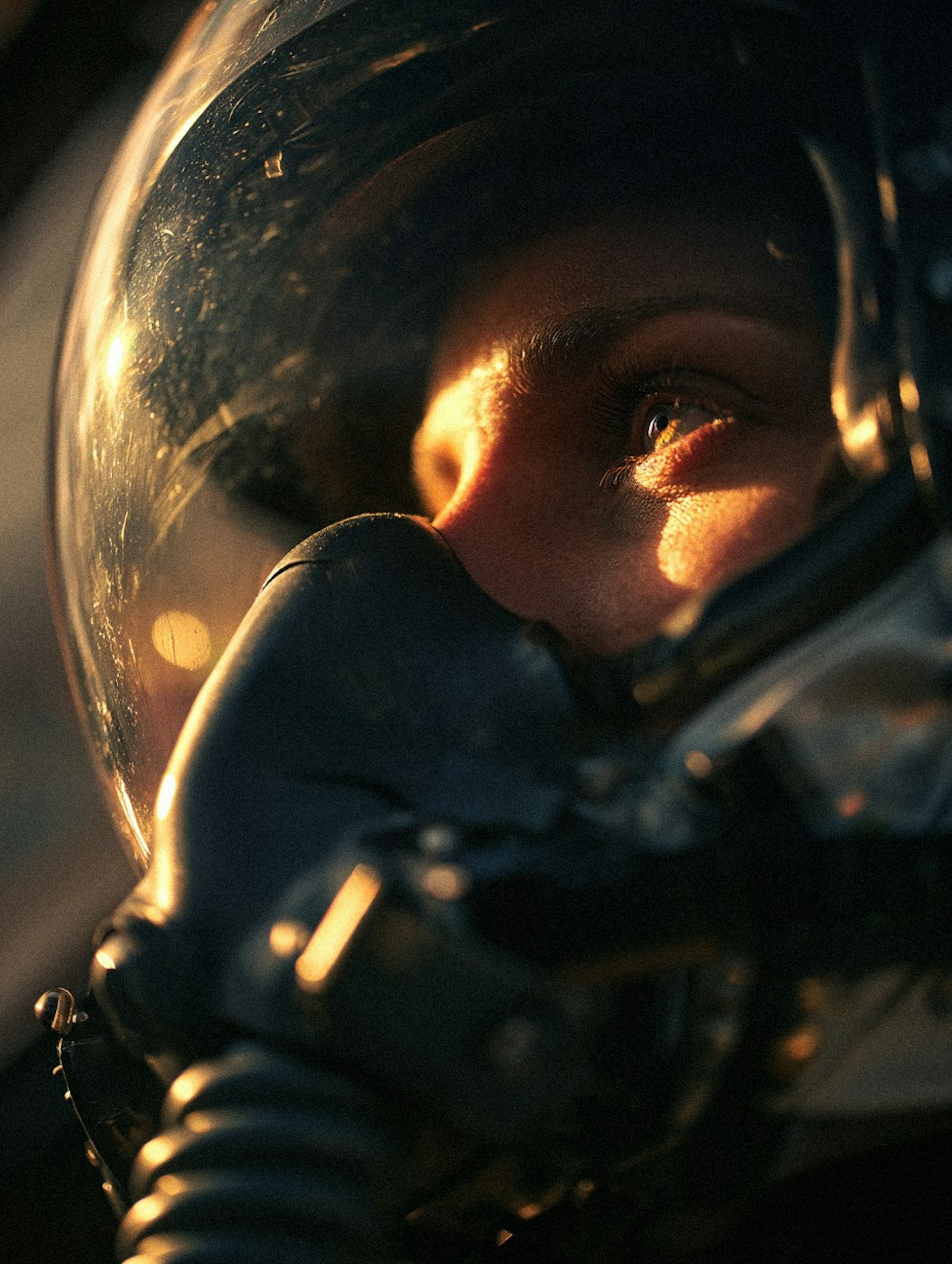 Close-up of a pilot's face in a helmet and oxygen mask, with sunlight reflecting off the visor, creating a dramatic and focused scene.