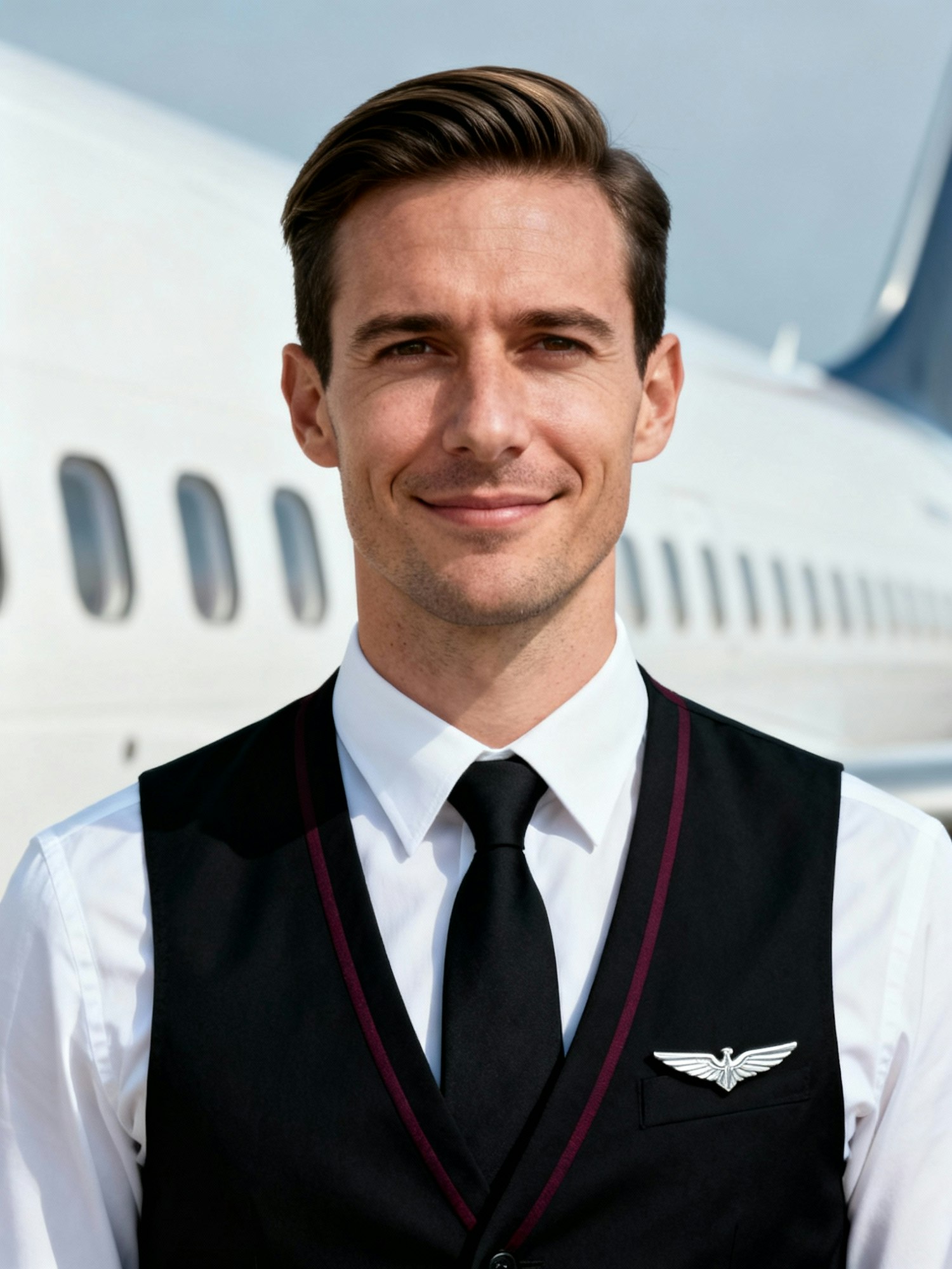 A professional airline crew member in uniform standing in front of an airplane, exuding confidence and professionalism.