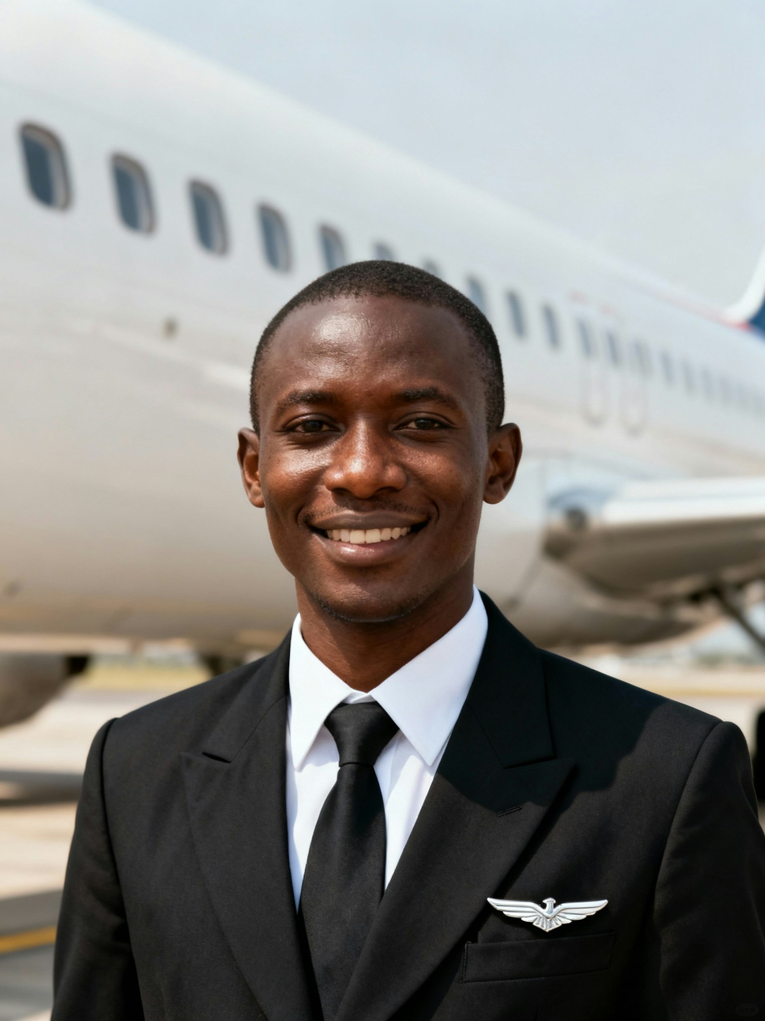 Outdoor airport portrait of a Kenyan man cabin crew, 32; dark-brown skin (warm); short cropped hair; clean shave; black cabin-crew jacket, white shirt, matte black tie, silver wing pin (no logo). Pose: head upright (0–2° roll), chin parallel to floor, shoulders level and squared; eyes to camera; composed welcoming smile. Framing: head-and-shoulders (not tight), 8–12 % headroom; crop at upper chest; centered; 3:4 vertical. Background: “blurred commercial airliner fuselage with window line, no logos or tail numbers, same angle and distance.” Lighting: soft open-shade daylight; balanced exposure on skin highlights. Lens/Optics: 105 mm at ~f/2.8 for shallow depth and softness; macro-sharp on eyes; neutral WB; exposure matched. Uniform rule: black jacket, white shirt, matte black tie. Negative: tilted horizon, visible registration, over-bright edits.
