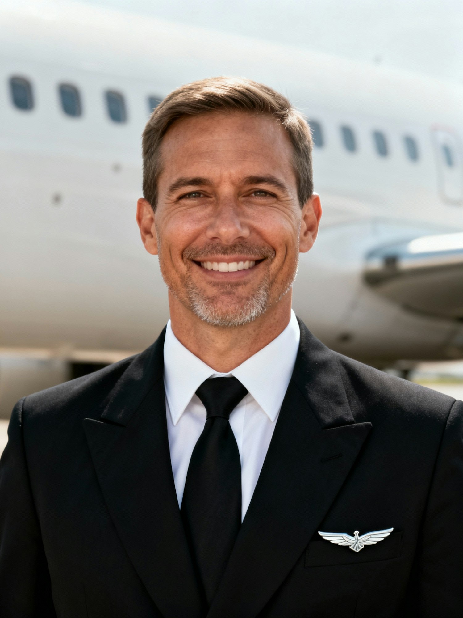 Outdoor airport portrait of an American man cabin crew, 35; light-medium skin (neutral); short tidy hair; light stubble; black cabin-crew jacket, white shirt, matte black tie, small silver wing pin (no logo). Pose: head upright (0–2° roll), chin parallel to floor, shoulders level and squared; eyes to camera; friendly confident smile. Framing: head-and-shoulders (not tight), full head visible with 8–12 % headroom; crop at upper chest; centered; 3:4 vertical. Background: “blurred commercial airliner fuselage with window line, no logos or tail numbers, same angle and distance.” Lighting: soft open-shade daylight. Lens/Optics: 105 mm at ~f/2.8; macro-sharp on eyes; neutral WB; exposure matched. Uniform rule: black jacket, white shirt, matte black tie. Negative: head tilt, glare, branding, harsh contrast.