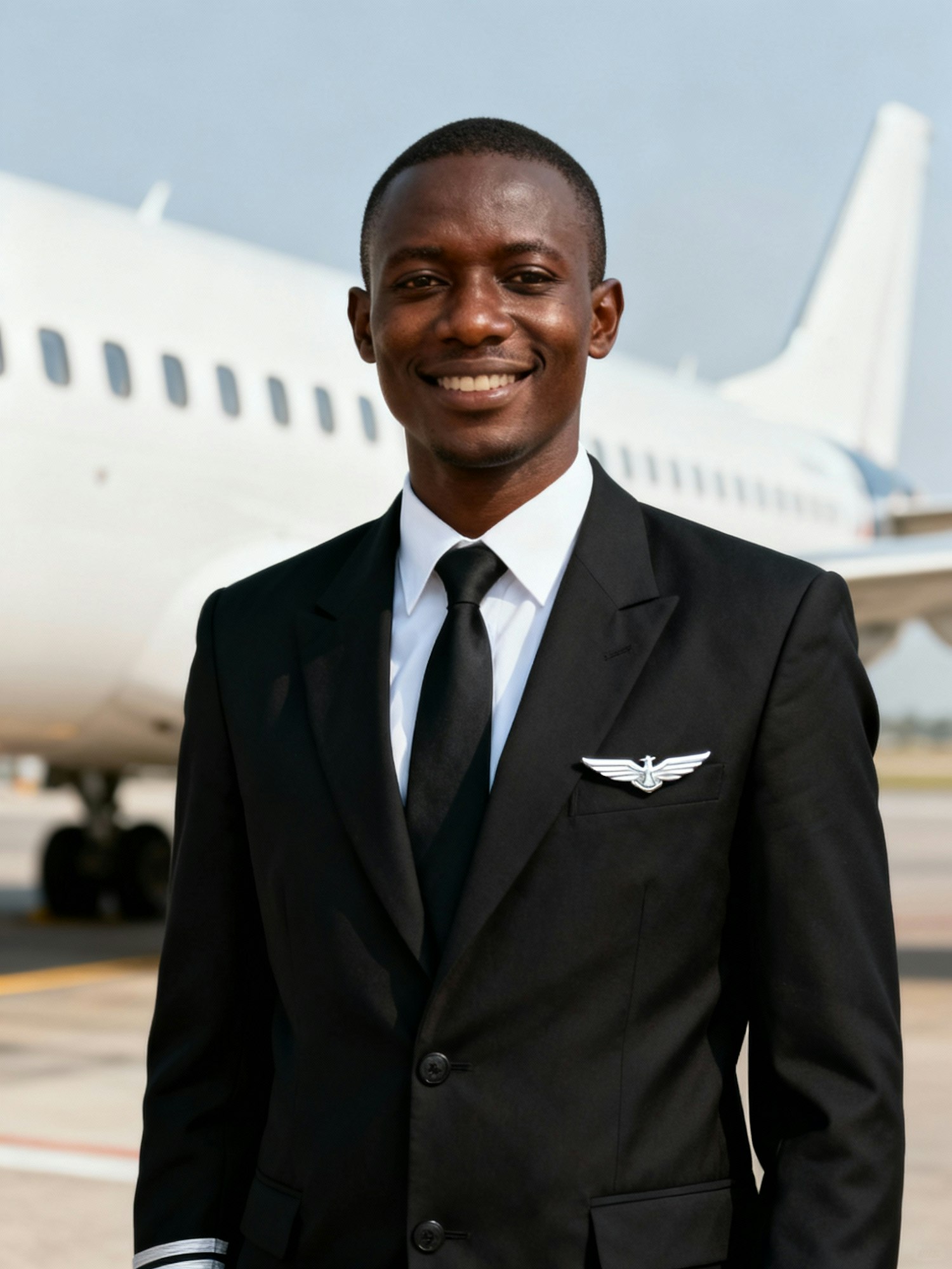 A pilot in uniform smiles confidently in front of a parked airplane on a sunny day, showcasing professionalism and aviation pride.