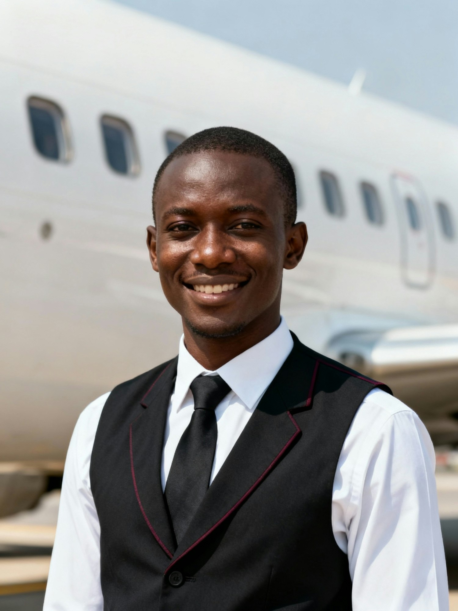Outdoor airport portrait of a Kenyan man cabin crew, 32; dark-brown skin (warm); short cropped hair; clean shave; white shirt + black vest with burgundy piping, matte black tie. Pose: head upright (0–2°), chin parallel, shoulders level; eyes to camera; composed welcoming smile. Framing: head-and-shoulders, 8–12% headroom; upper-chest crop; centered; 3:4. Background: “blurred commercial airliner fuselage with window line, no logos or tail numbers, same angle and distance.” Lighting: soft open shade with balanced highlights. Lens: 105 mm ~f/2.8. Uniform rule: same. Negative: Dutch angle, visible branding, epaulettes/stripes, over-retouch.