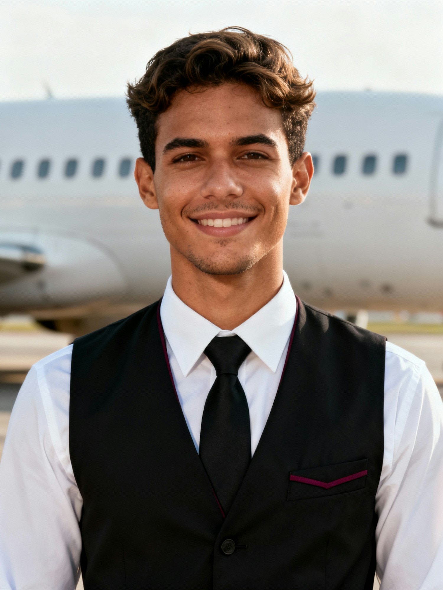 Outdoor airport portrait of a Brazilian man cabin crew, 29; medium-light skin (warm); short wavy hair; clean shave; white shirt + black vest with burgundy piping, matte black tie. Pose: head upright, chin level, shoulders squared; eyes to camera; friendly half-smile. Framing: H&S; 8–12% headroom; centered; 3:4. Background: “blurred commercial airliner fuselage with window line, no logos or tail numbers, same angle and distance.” Lighting: soft daylight. Lens: 105 mm ~f/2.8. Uniform rule: same. Negative: head tilt, glare, epaulettes, heavy smoothing.