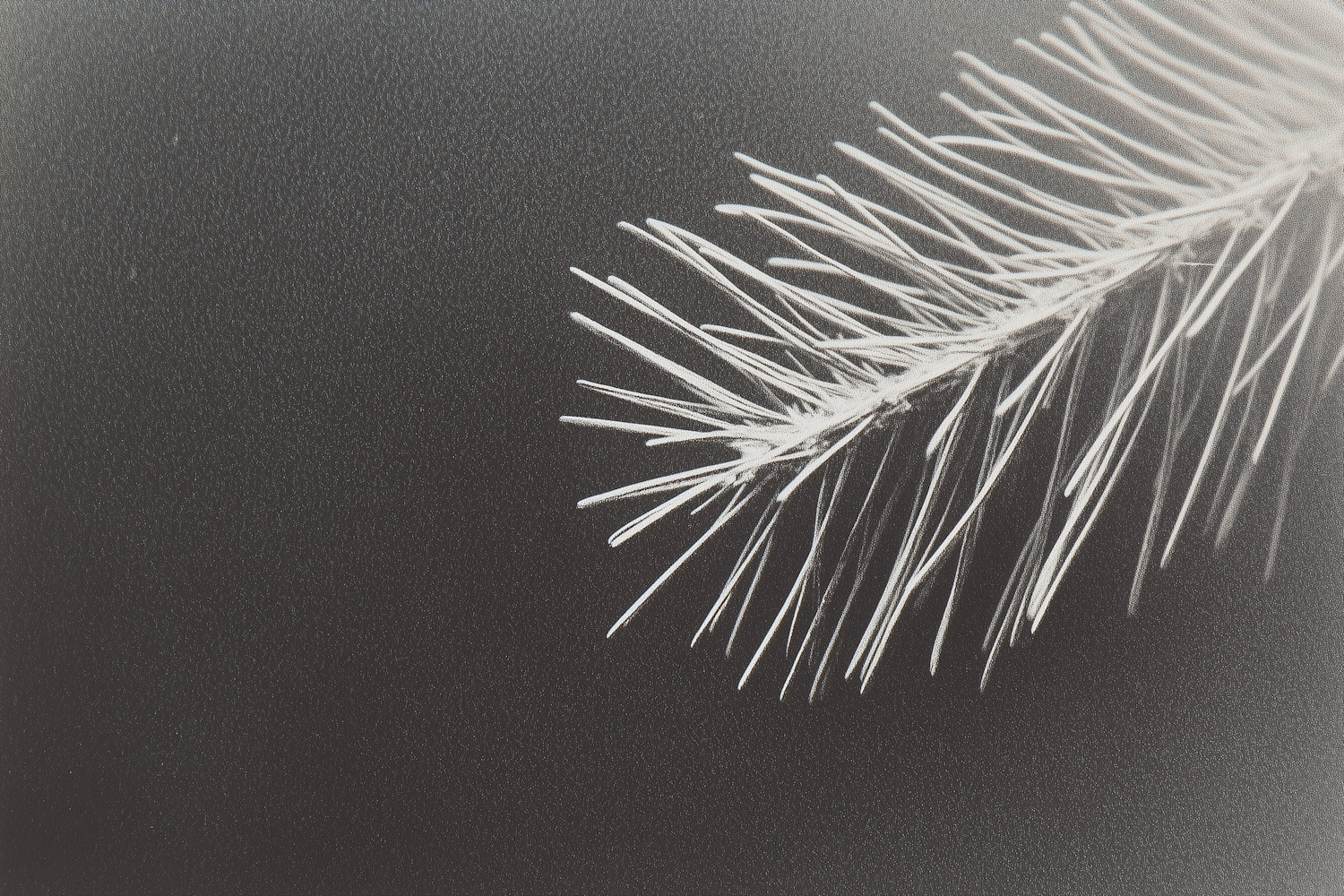 Minimalist close-up of a white pine needle branch on a dark textured background, showcasing fine details and striking contrast.