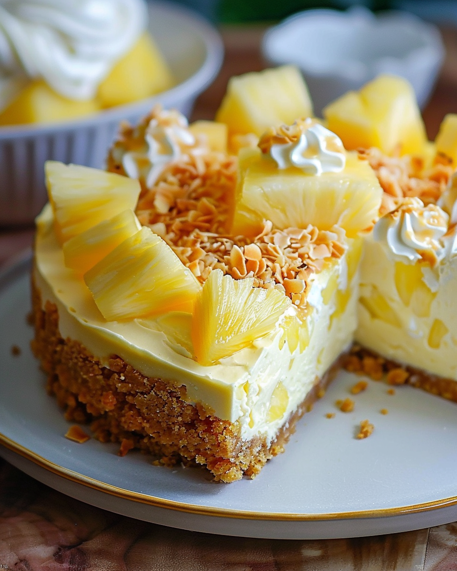 Tropical pineapple cheesecake with a crumbly crust, creamy filling, and fresh pineapple chunks, topped with whipped cream and coconut flakes.