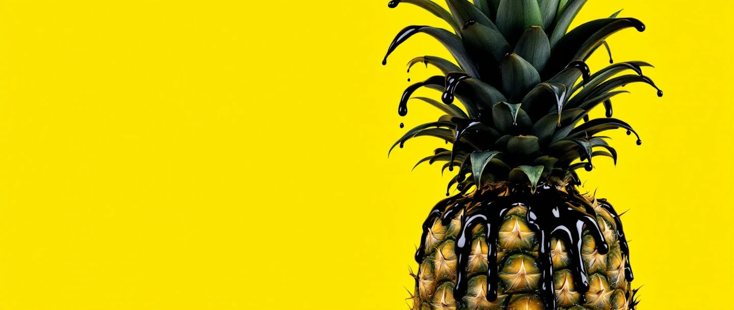 A pineapple with glossy black liquid dripping over it, set against a bold yellow background for a striking and surreal visual effect.