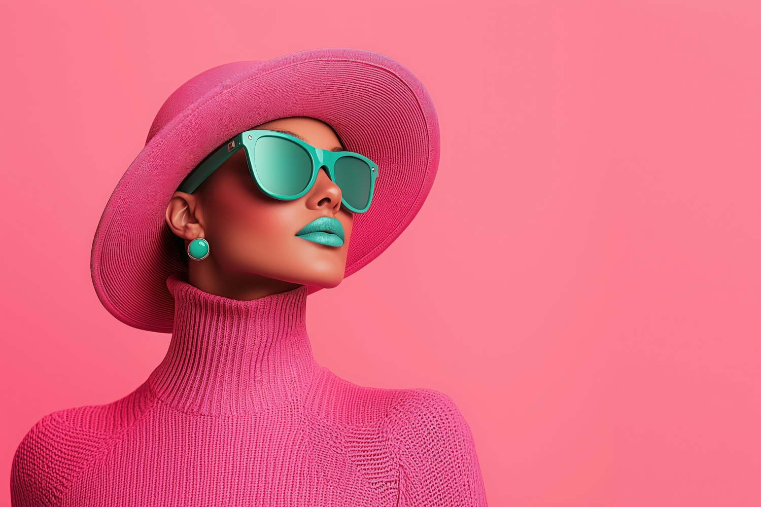 Bold fashion portrait with pink and turquoise contrast. Woman in a pink hat, sweater, turquoise sunglasses, and matching lipstick.