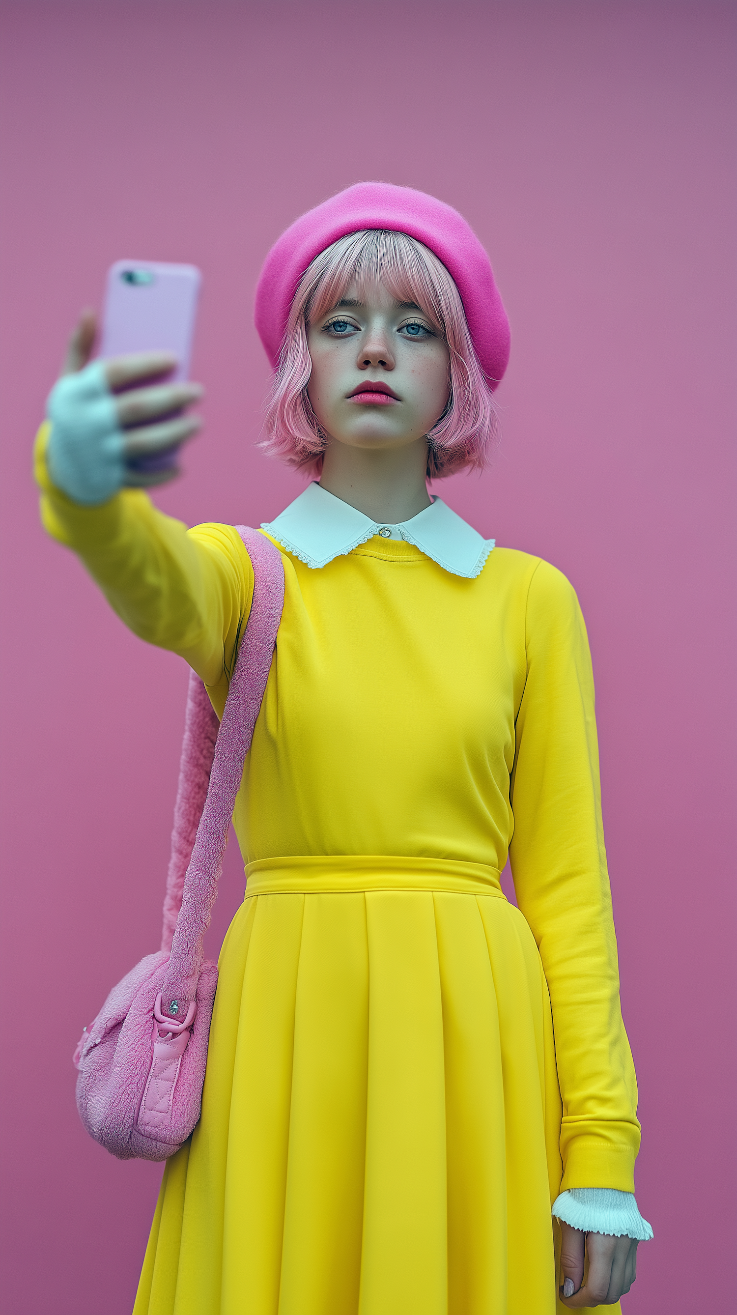 A stylish woman in a yellow dress and pink beret takes a selfie against a pink background, showcasing a bold and colorful aesthetic.