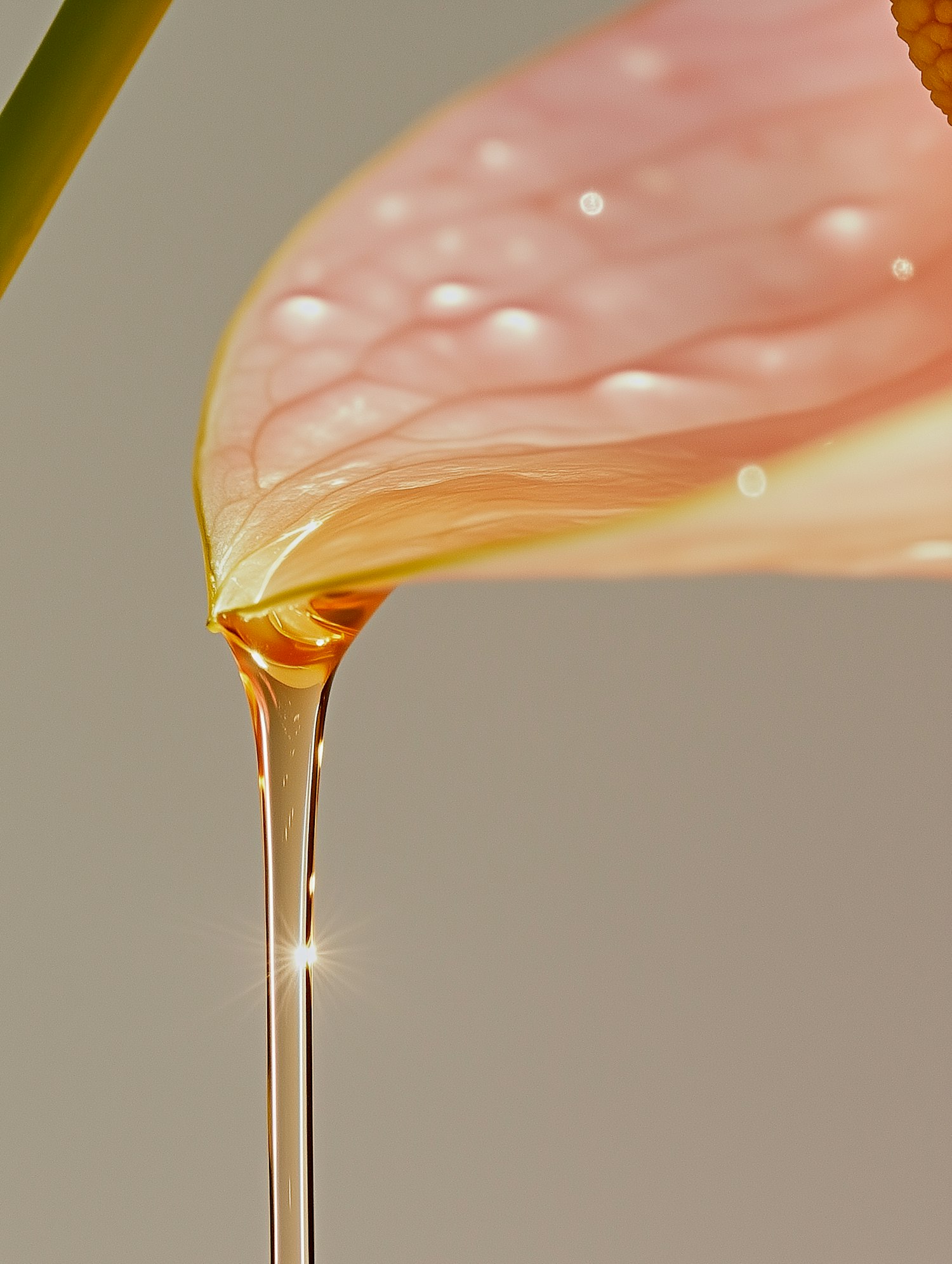 Close-up of a pink anthurium flower with golden liquid dripping elegantly, reflecting light in a serene, artistic composition.