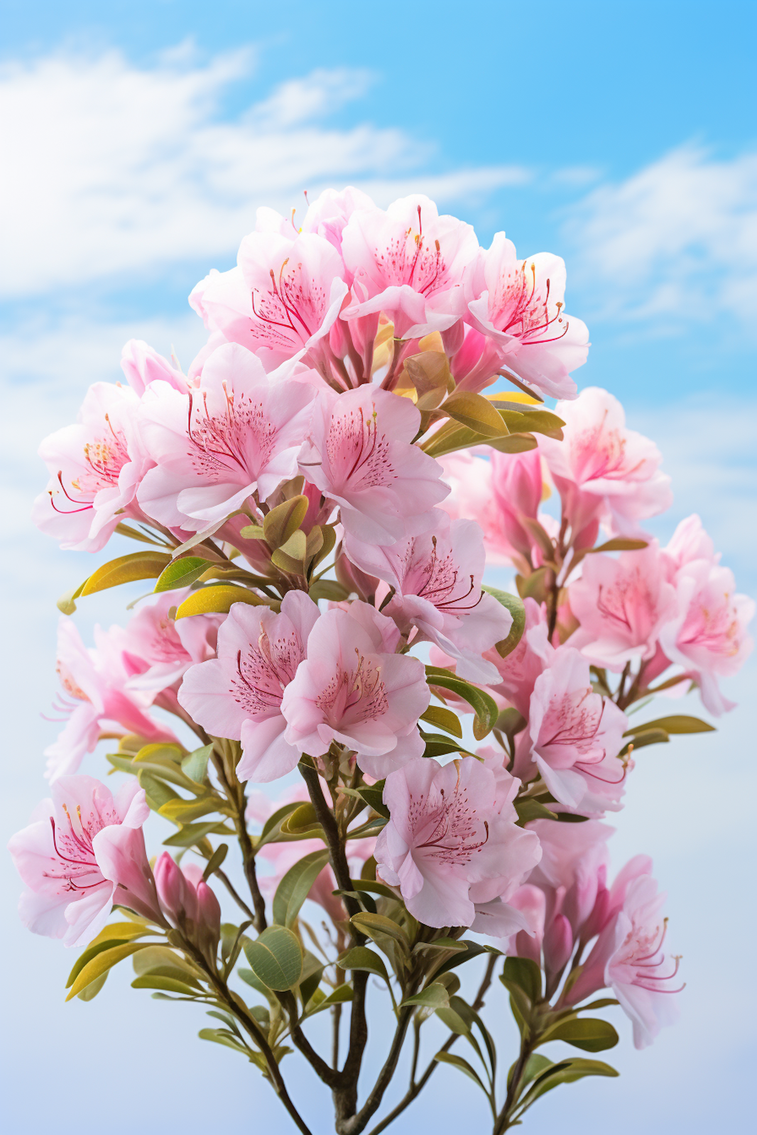 Vibrant pink azalea flowers bloom against a clear blue sky, showcasing delicate petals and lush green leaves.