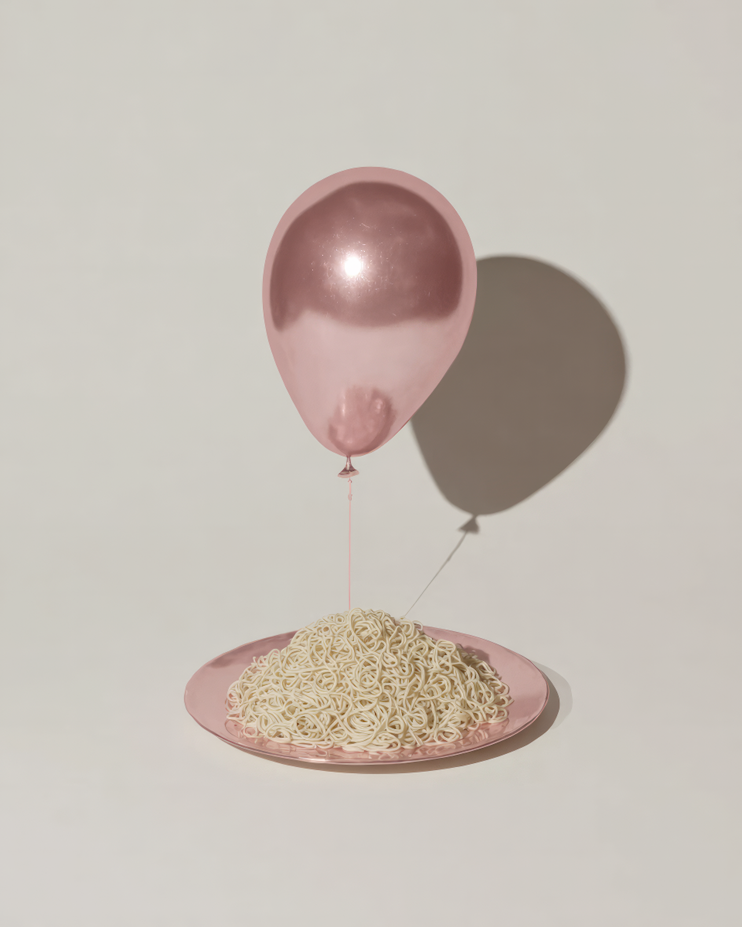 A pink metallic balloon tied to a plate of uncooked noodles, set against a neutral background for a minimalist and artistic vibe.