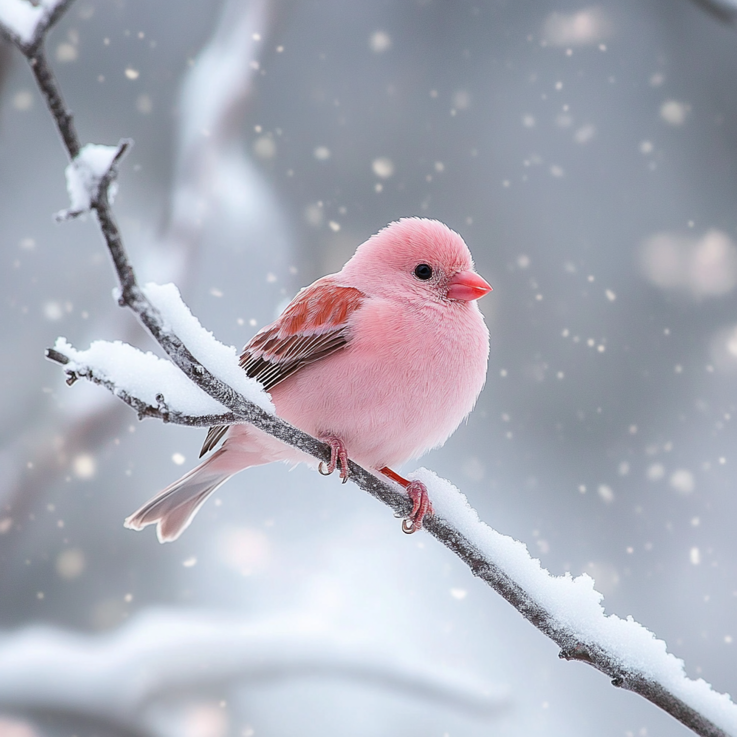 A pink bird perched on a snowy branch with falling snowflakes, creating a serene winter scene.
