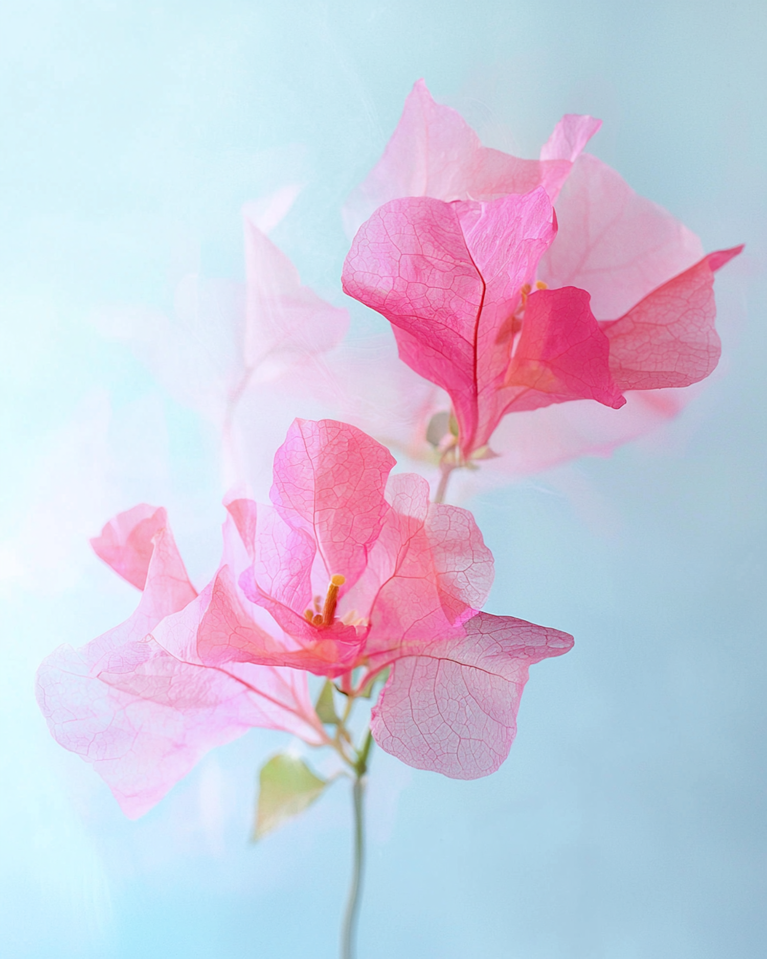 Delicate pink bougainvillea flowers with translucent petals on a soft blue background, creating a dreamy and serene aesthetic.