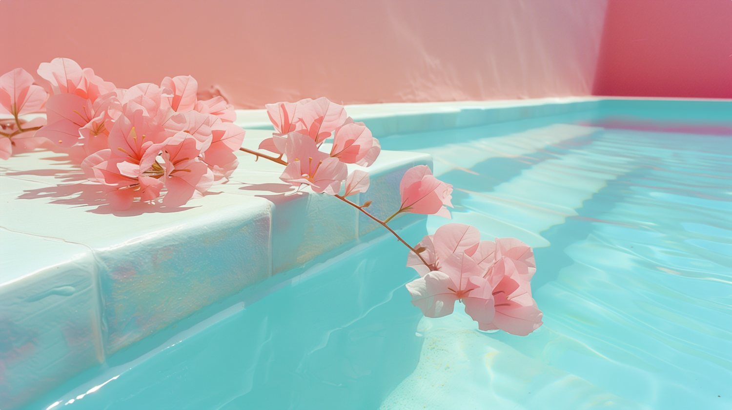 Delicate pink flowers resting by a turquoise pool, with a pastel pink wall in the background, creating a serene and tranquil scene.
