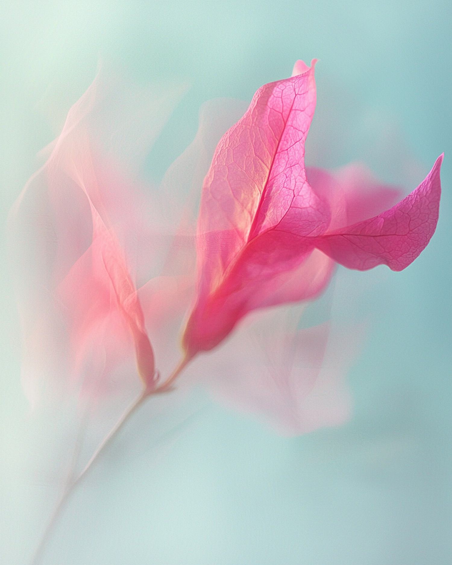 Dreamy close-up of a pink bougainvillea flower with soft focus and pastel blue background, highlighting its delicate, semi-transparent petals.
