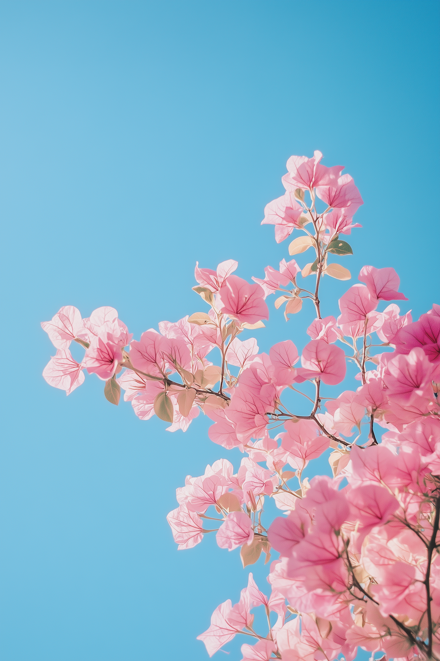 Bright pink bougainvillea flowers with light green leaves set against a clear blue sky, creating a serene and vibrant springtime scene.