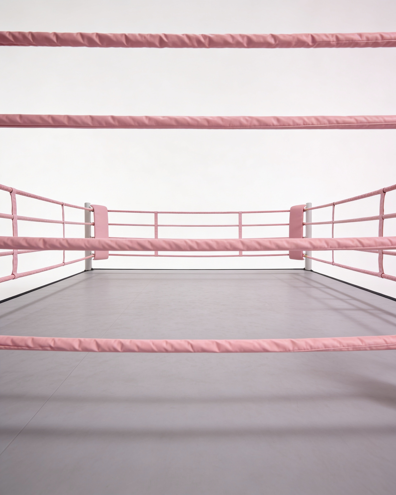 A minimalistic boxing ring with pink ropes and a gray floor, set against a white background, creating a clean and modern look.