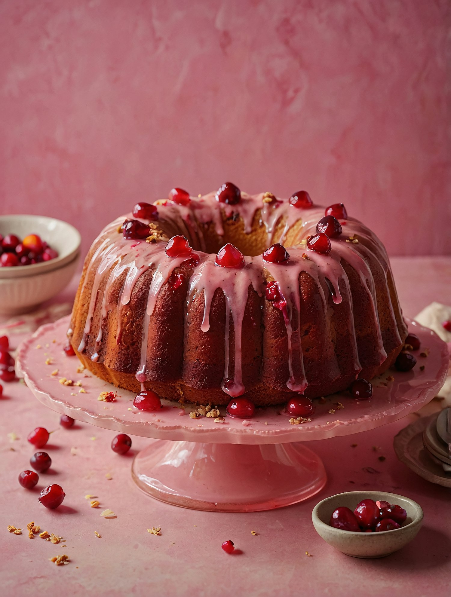 A stunning bundt cake with pink glaze and cranberries on a pink stand, surrounded by bowls and plates for a cozy dessert vibe.