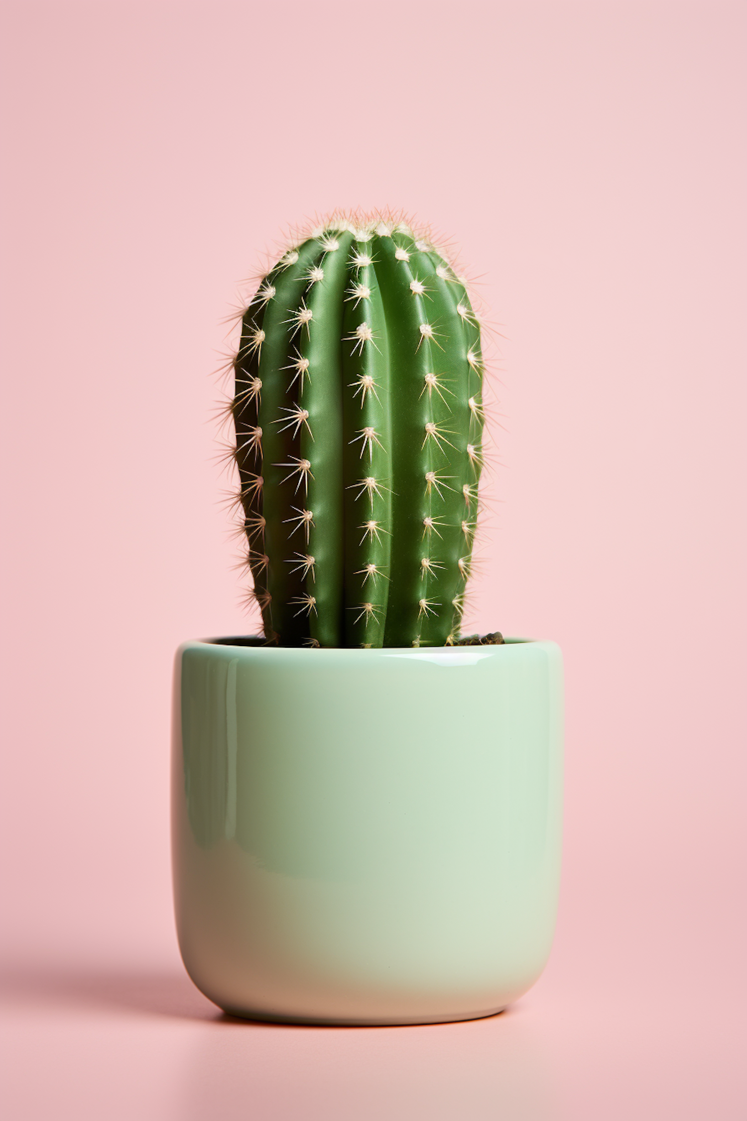 Green cactus in a mint pot against a pink background, showcasing a minimalist and vibrant aesthetic.