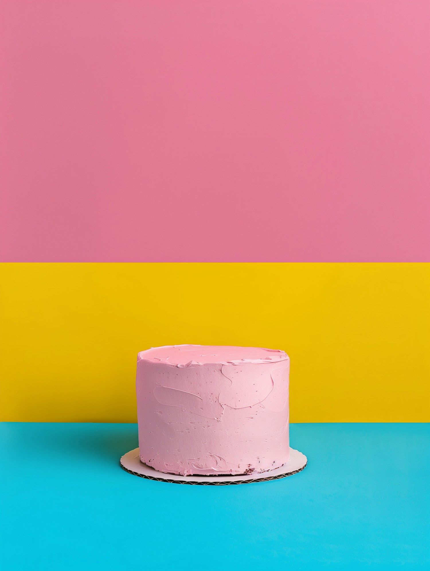 A pink frosted cake on a vibrant background with pink, yellow, and blue sections, creating a playful and colorful aesthetic.