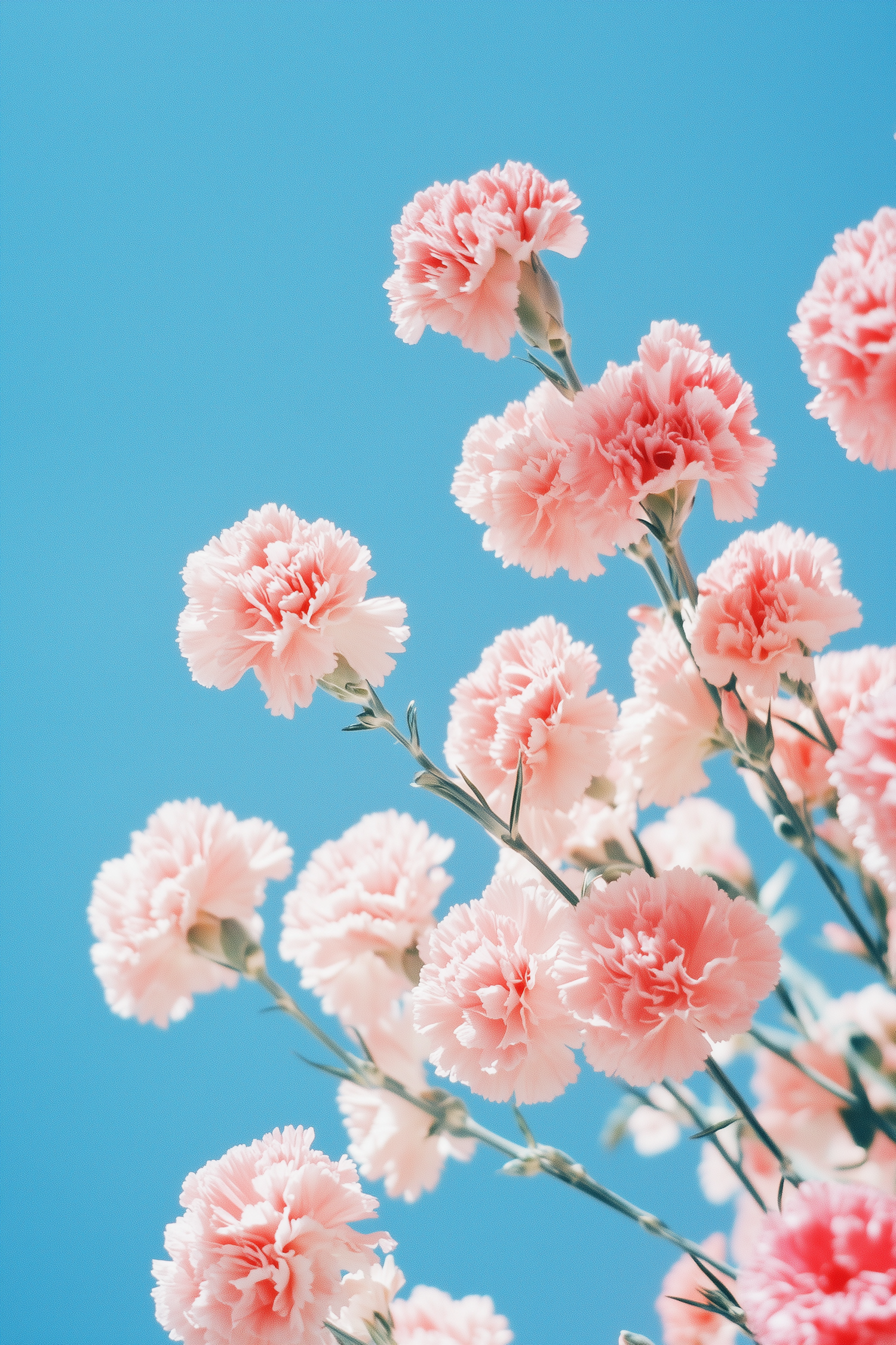Soft pink carnations in full bloom against a vibrant blue sky, creating a serene and cheerful floral composition.