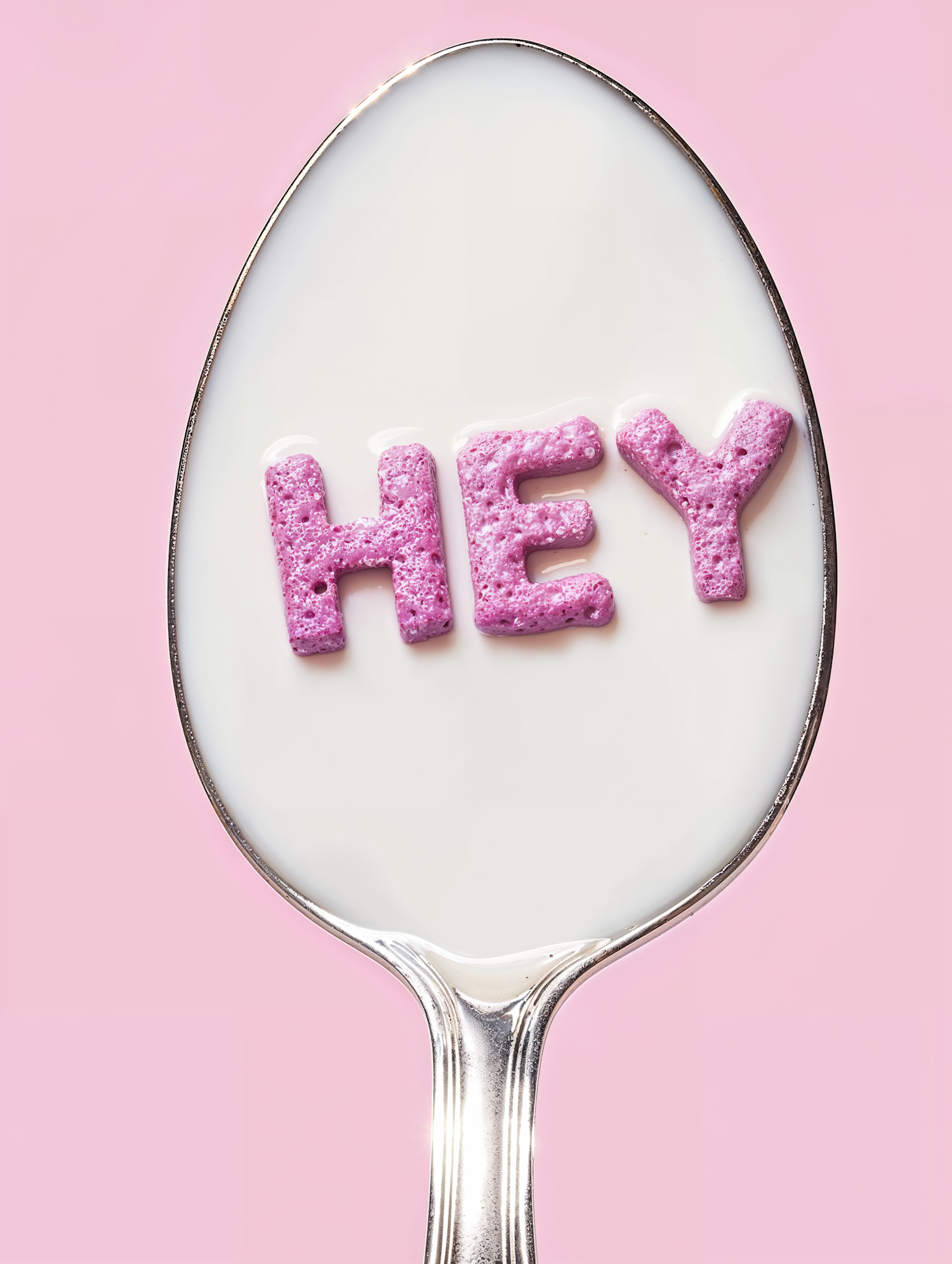 A silver spoon with milk and pink cereal letters spelling 'HEY' on a pastel pink background. Fun and minimalistic breakfast vibes!